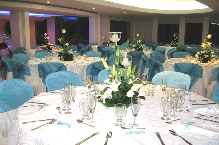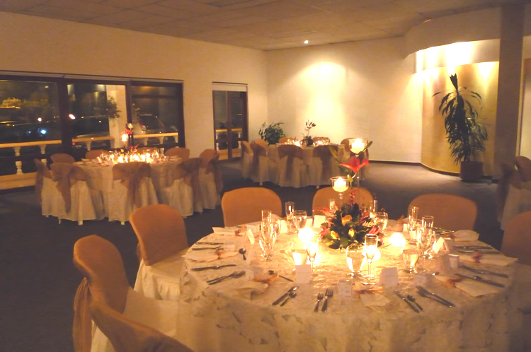 Durante la noche: En este caso se puede utilizar mantelería en blanco, beige, tonos ocres ó colores satinados como el dorado. Por supuesto velas y arreglos con luz.
